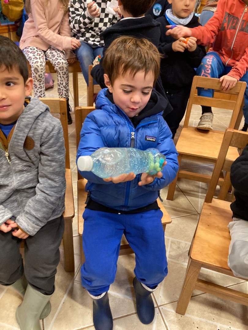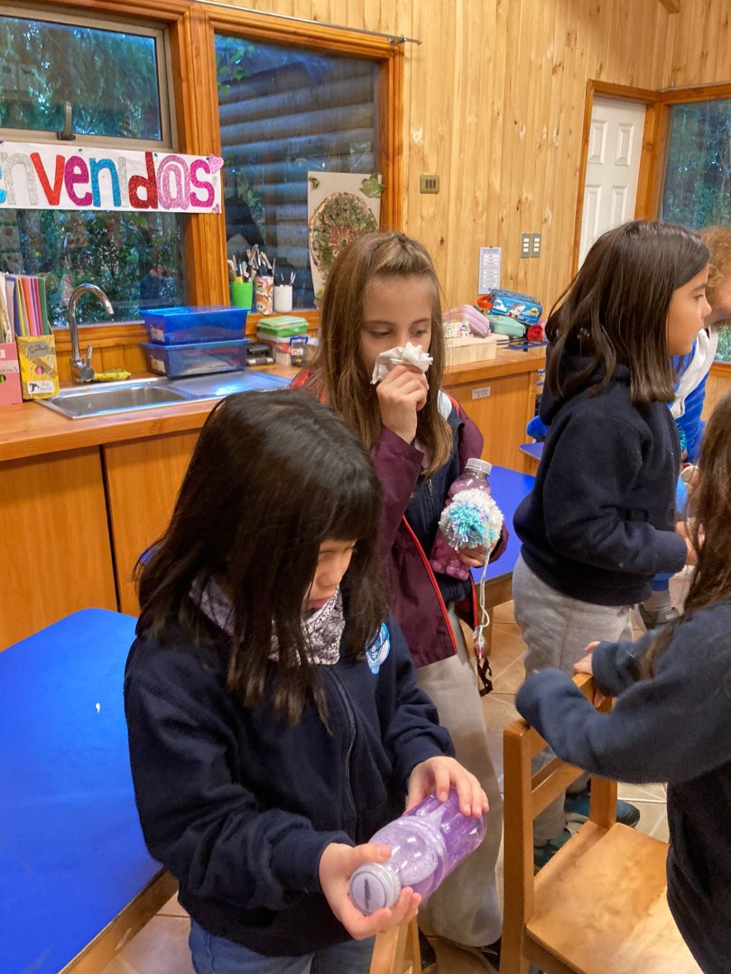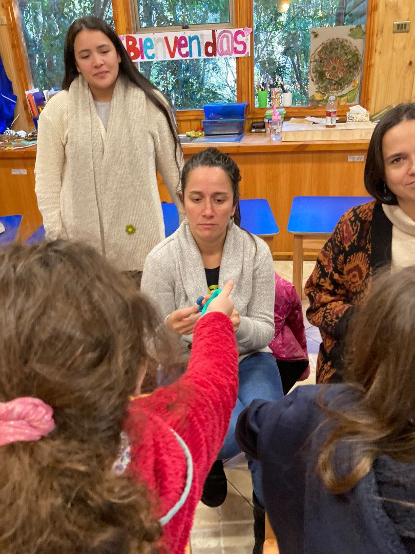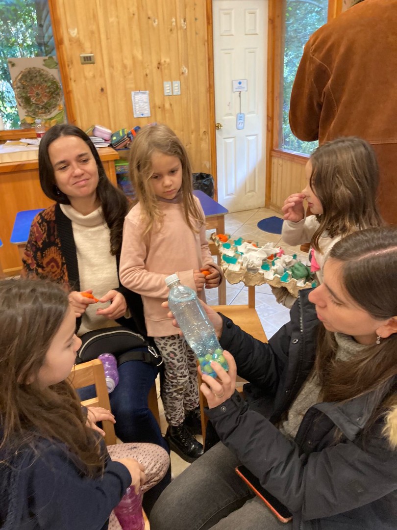 Por medio de un trabajo en parejas y tríos confeccionaron, a partir de algunos materiales reciclados, distintos objetos que favorecen la regulación emocional por medio de los sentidos, como por ejemplo, botellitas de la calma, pelotitas apretables, sonajeros, alfombra sensorial, bolsitas aromáticas.